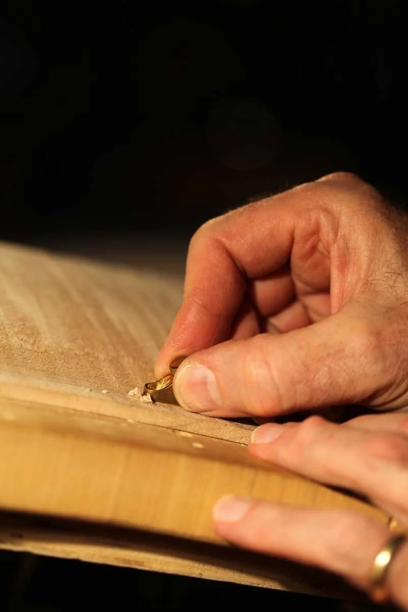 Once the top and back are complete, Christopher plots where the f-holes will be. After cutting the f-holes, he installs the bass bar and continues work on the scroll.